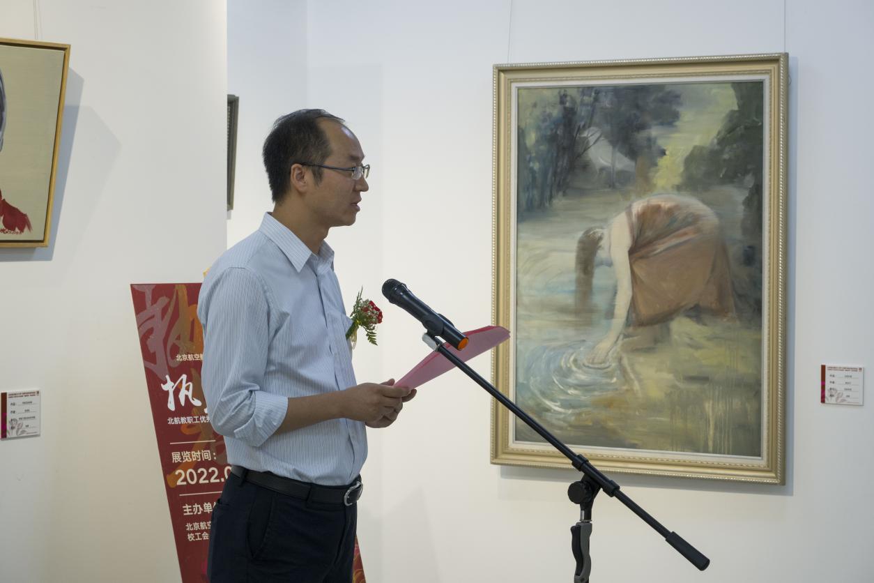 程文浩在致词中指出,在迎接北航建校70周年之际,为表达和抒发教职工对学校深厚的热爱之情,校工会联合校庆工作办公室特举办本次展览。本次展览作品主题鲜明,内容丰富,风格多样,凝结了广大教职工艺术智慧的结晶,也凝聚了“博雅师苑”优秀的办学成果,具有一定的思想性、艺术性和观赏性,充分展现了北航教职工执著高雅的精神内涵与奋发向上的精神风貌。艺术之花的竞相绽放得益于艺术沃土的深厚滋养,“博雅师苑”争做北航校园美育工作的一方沃土。继2019年举办首届“博雅师苑”优秀作品展,值此北航建校70周年之际,校工会特推出第二届“博雅师苑”优秀作品展。校工会将继续秉承关心关爱教职工、为教职工提供精细服务的理念,将沙河校区“博雅师苑”教职工兴趣课堂越办越好,为丰富沙河校区教职工的业余文化生活、为沙航校园美育工作做出更大贡献。