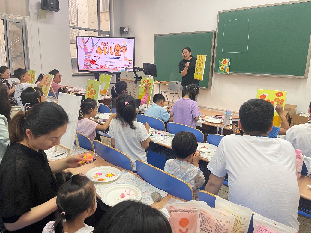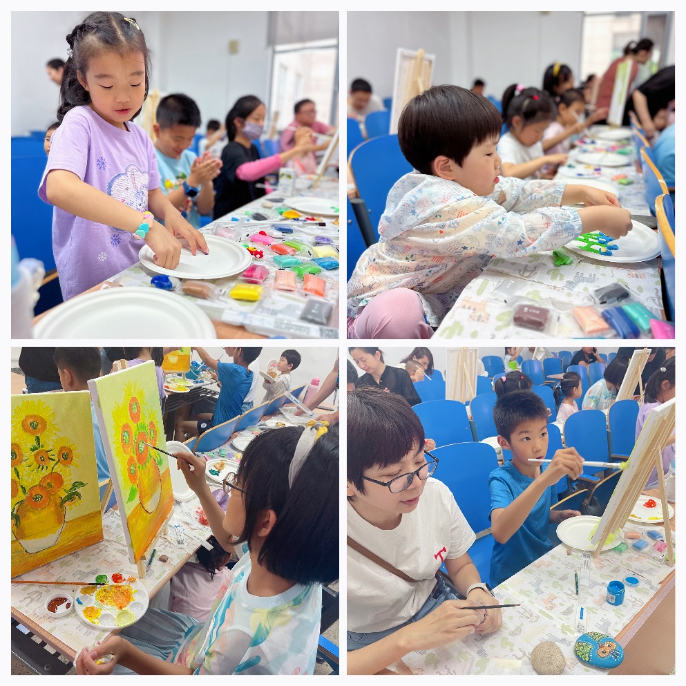 在专业老师的带领下,小朋友们和家长积极参与,认真地学习如何制作彩绘石头、黏土盘。大家还在老师指导下学习了“向日葵”丙烯绘画。“前沿宝贝”们纷纷拿起画笔,在家长的陪伴下,发挥想象力,积极创作,认真勾画,用鲜艳的色彩涂鸦烂漫的童年时光,用稚嫩的笔触描绘欢快美好的节日。很快,一个个创意十足、形象生动的作品展现在大家眼前。参与活动的教职工们也度过了一段难忘的亲子时光。