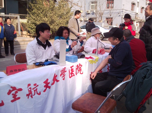 2013年3月5日,学雷锋活动日当天,校医院联合校红十字会、后勤集团在北航超市发门前为社区居民及广大在校师生开展义诊和免费服务活动。在副院长曹丽娟带领下,校医院外科大夫杨晓松、崔桂荣、彭春兰等认真热情地解答居民提出的相关健康咨询,并免费测血压200余次、发放健康教育资料150余份,此次学雷锋活动还包括献血、法律咨询、维修及免费修车、理发等活动,场面热烈,大家热情高涨,得到了广大居民及师生的赞扬。一位居民说道:“你们都是活雷锋,真希望天天都有这样的活动,让我们对自己的健康和生活少一份担心!”