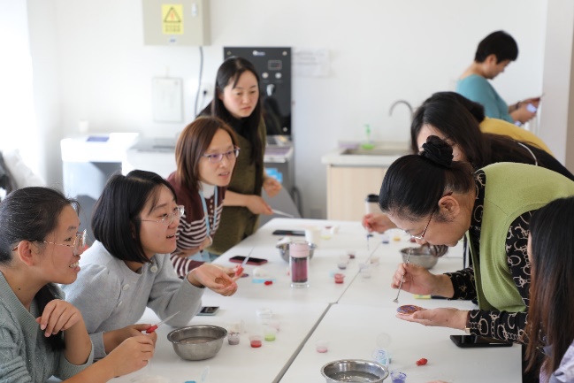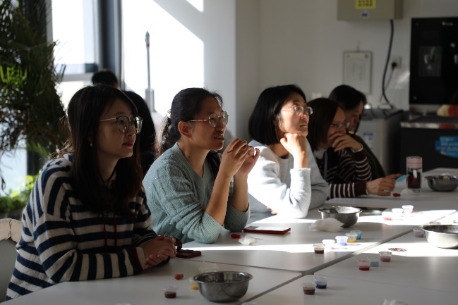 在两位专家的指导下,大家体验了景泰蓝工艺中其中最有魅力的点蓝,即用吸管或者蓝枪(金属小铲子),把碾细了的釉色填入提前做准备好的丝工空隙处。看似简单,其中对于颜色的搭配、釉料填充的完整性、色彩的渐变把握要求极高。参与活动的教职工耐心钻研、大胆创新,每个人都创造了一份属于自己的独特艺术品。活动在一片欢声笑语中结束,得到了广大教职工的一致好评。
