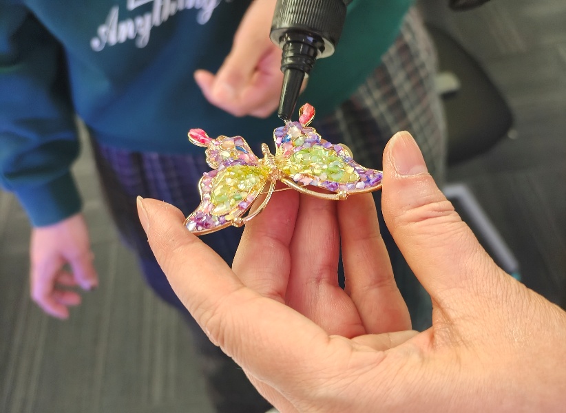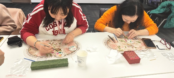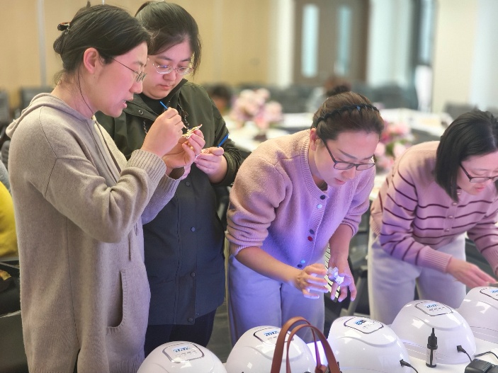 下午的活动迎来了重头戏——非遗螺钿技艺体验。学院特别邀请了北京市非遗螺钿技艺传承人赵雨老师现场授课。赵雨老师首先为大家介绍了螺钿工艺的历史渊源、制作流程及其艺术价值,并展示了精美的螺钿工艺品。随后,在赵雨老师的指导下,女教工们亲手体验了螺钿镶嵌的工艺。大家精心挑选贝壳材料,细致地进行切割、打磨和镶嵌,最终完成了一件件独具匠心的作品。活动现场气氛热烈,大家纷纷表示,这次体验不仅让自己感受到传统工艺的魅力,也激发了创新思维和艺术灵感。
